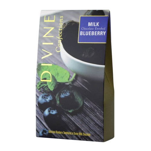 Chocolate Fruit - Divine Confections Milk Chocolate Blueberries: Decadent luxurious chocolate enrobed blueberries crafted by artisans from dried blueberries covered in milk chocolate with a sweet and crisp candy coating.